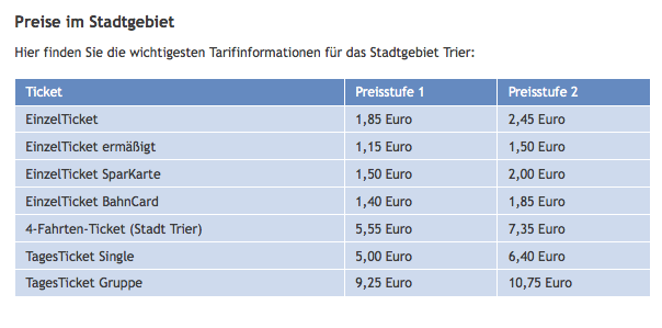 Die Stadt Trier bietet aufgrund ihres sehr ausgeprägten Linienverkehrs innerhalb der Tarifzonen, eine mehrfälltige Auswahl an Möglichkeiten an, ein Ticket zu seinem eigenen Gunsten zu erwerben, ohne unnötige Gelder zu verschwenden. Ein Beispiel dafür ist das Einzelticket, dass verschiedene Preiskategorien beinhaltet wie in der oben aufgeführten Tabelle zu erkennen ist. Ebenfalls ist es möglich bei einem eintägigen Aufenthalt zu sparen in Form eines Tagestickets. Somit kann man ganztägig innerhalb der Tarifzonen fahren für einen günstigen Preis. Leider oben nicht aufgeführt, gibt es auch die Möglichkeit Mehrfachtickets zu erwerben, wenn man einem langfristigen Aufenthalt nachgeht.